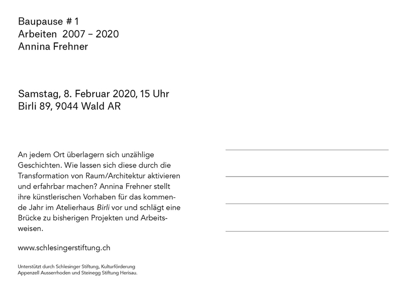 An jedem Ort überlagern sich unzählige Geschichten. Wie lassen sich diese durch die Transformation von Raum /Architektur aktivieren und erfahrbar machen? Annina Frehner stellt ihre künstlerischen Vorhaben für das kommende Jahr im Atelierhaus Birli vor und schlägt eine Brücke zu bisherigen Projekten und Arbeitsweisen.